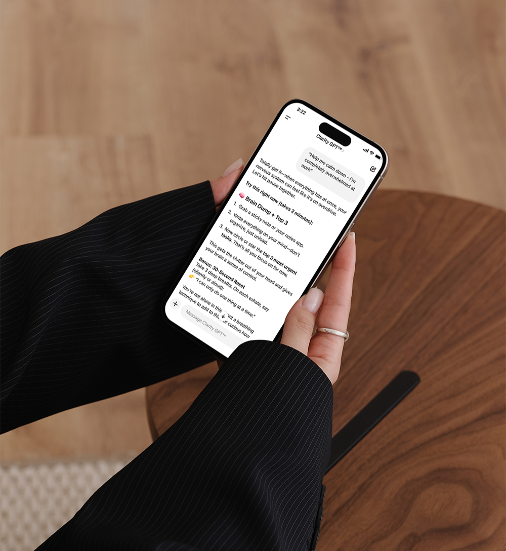 Our AI Clarity Coach is like having a calm, science-backed stress guide in your pocket. Whether you're overwhelmed at work, struggling to focus, or just need a mental reset, it’s here to help with proven techniques, mindset shifts, and personalized support — anytime you need it. Join our newsletter to get early access and start your clarity journey.